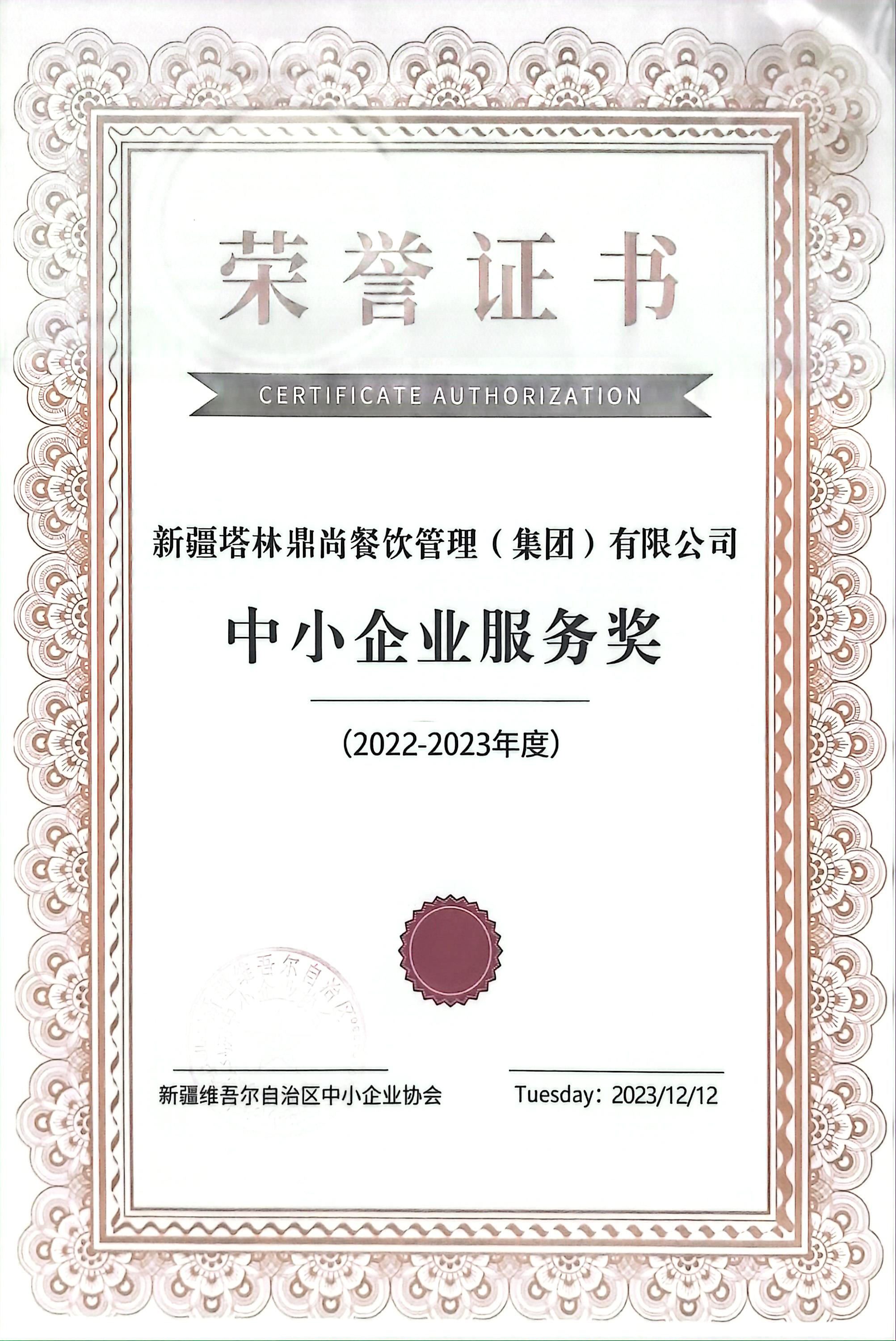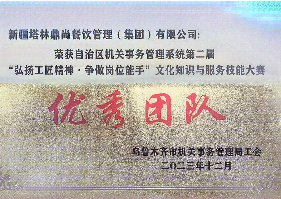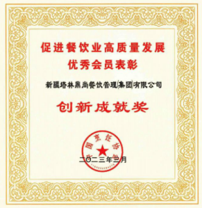 多次獲得大型比賽獎項 公司先后取得2019年全國百強企業,2020年清真餐飲百強企業,GB/T 19001-2008/ISO 9001:2008質量管理體系認證,GB/T 22000-2006/ISO 22000:2005及GB/T 27306-2008食品安全體系認證。近年來獲得“國際酒店4D管理示范企業”“中國誠信供應商”“克拉瑪依消費維權誠信企業”“中國餐飲企業知名品牌”“中國餐飲30年優秀企業”“2016年度中國清真餐飲“金駱駝”獎最具影響力優秀品牌”“2017年度百家中國好食堂”“全國綠色餐飲企業”